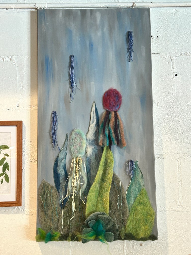 Underwater Adventure: Needle felted wool roving on Acrylic painted canvas, 24″W x 42″L, Available for purchase