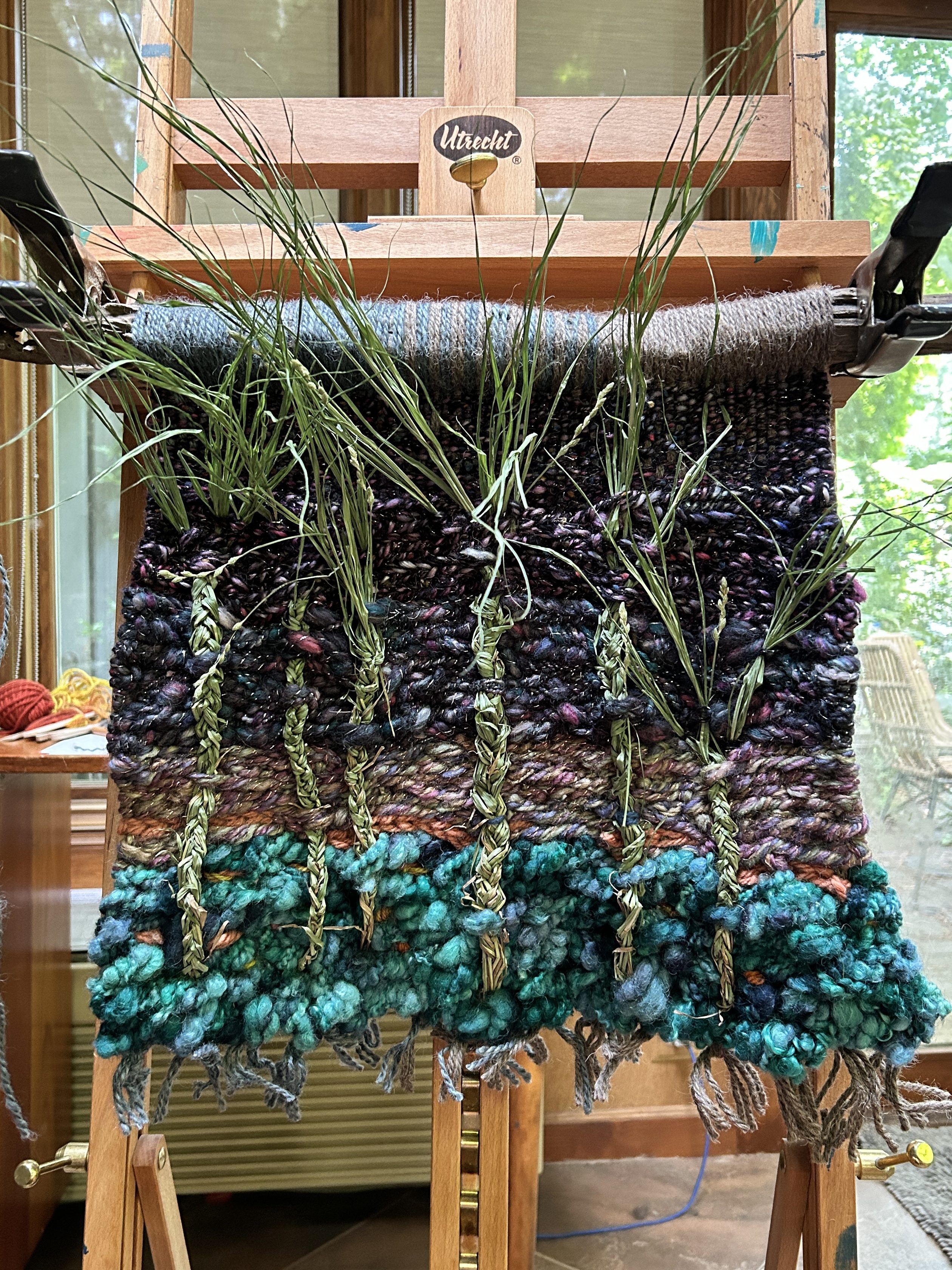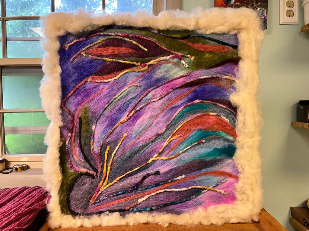 Summer Wind: Needle Felted Wool Roving, Yarn scraps on Canvas, 24″ x 24″, Available for sale